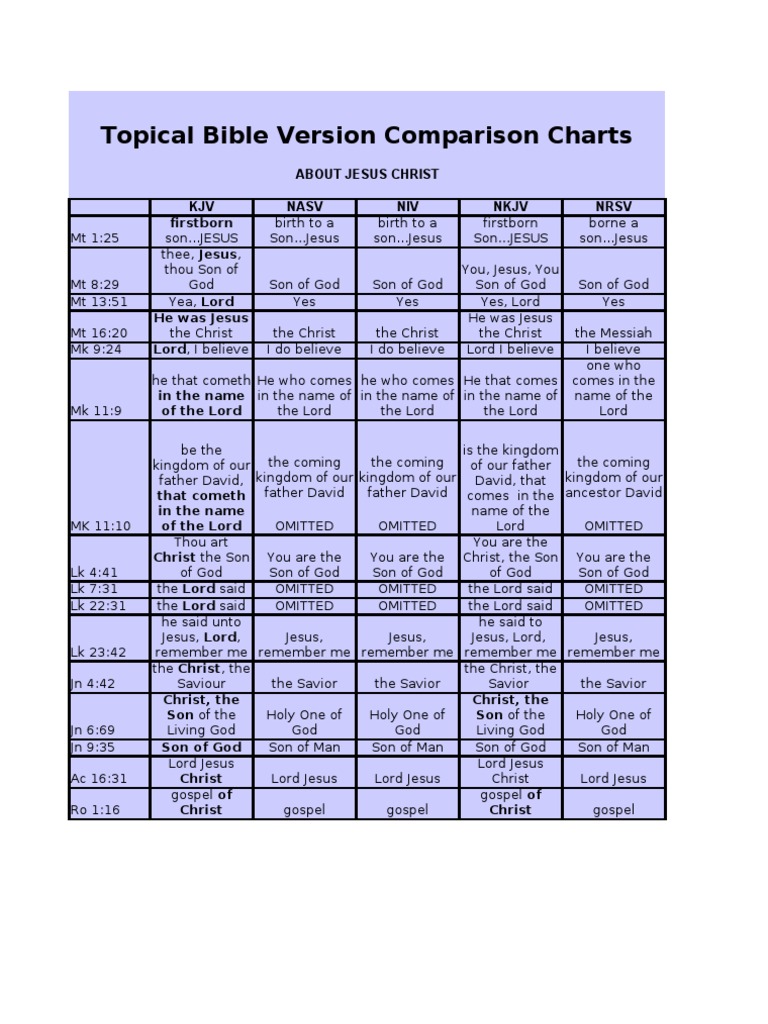 Compare the clear, natural english of god’s word and other translations. Web comparison chart of english bible translations showing style or type of translation and readibility or grade level. Study bible verses using niv, kjv, esv, and all versions found on one page. They will be compared in these seven categories: Web if there is no one around, then it does not matter if you name them silently or whether you speak aloud.