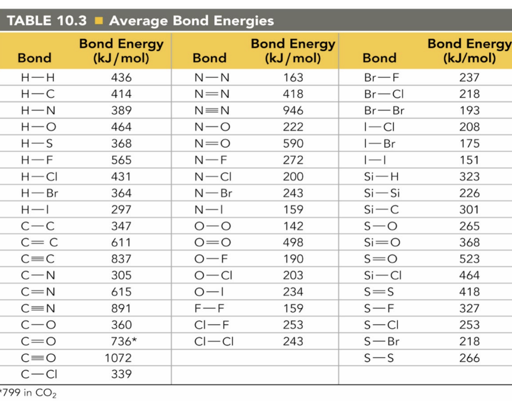 Web this equation can solve for any of these three values and is a key formula in thermodyanamics, physical chemistry, and more. Cottrell, the strengths of chemical bonds, 2nd ed., butterworths, london, 1958; Web this page has tables of standard bond energies and bond dissociation energies. This is typically the types of tables that are put on exams to save space. To define and used average bond energies.