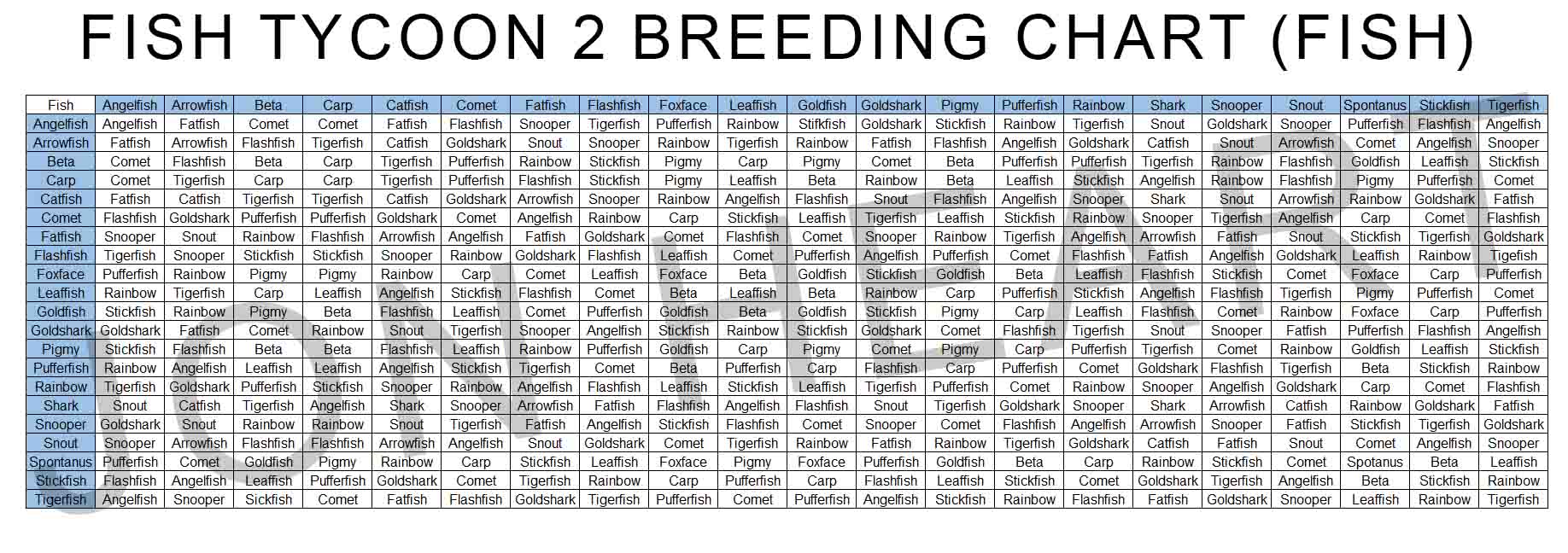 The table lists the offspring that result from crossing each type of fish with every other type. Default price & breeding chart. Web there are many possible ways to bread each of these fish. Blank excel fish tycoon breeding chart. A printable version of the breeding chart.