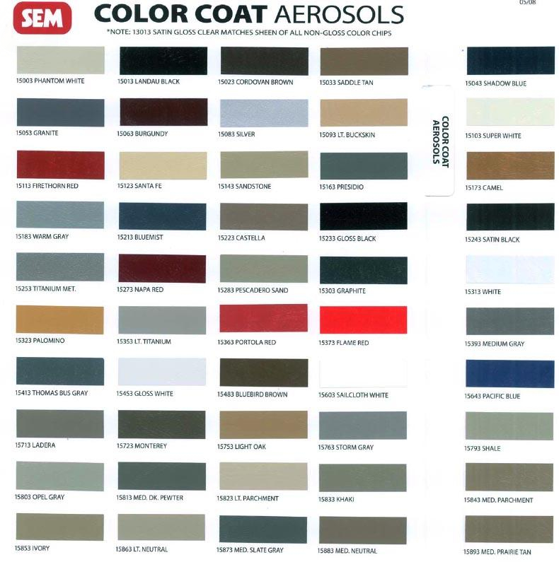 Browse our selection of options to find the right products for your vehicle. Excellent for vinyl, plastic, carpet, velour. Fm = ford motor co.; This item is out of stock. Web color coat is a specialty flexible coating formulated to restore or change the color of most vinyl surfaces, flexible and rigid plastics, carpet and velour. Web sem factory pack color chart. Web sem colorcoat color chart. This item is out of stock. Web color coat is the industry standard for vinyl or plastic restoration. Web sample card sem color coat aerosols 0. Web classic coat is a line of oem matched aerosols for renewing or restoring leather and vinyl. Web vinyl coat is a line of flexible aerosol coatings to match, restore or change the color of most marine vinyl and plastic surfaces. It is used for but not limited to vehicle seats, dashes, door panels, consoles & all plastic trims. Color coat is not a dye, but a fade resistant, flexible, and permanent coating. Vinyl paint & leather dyes.