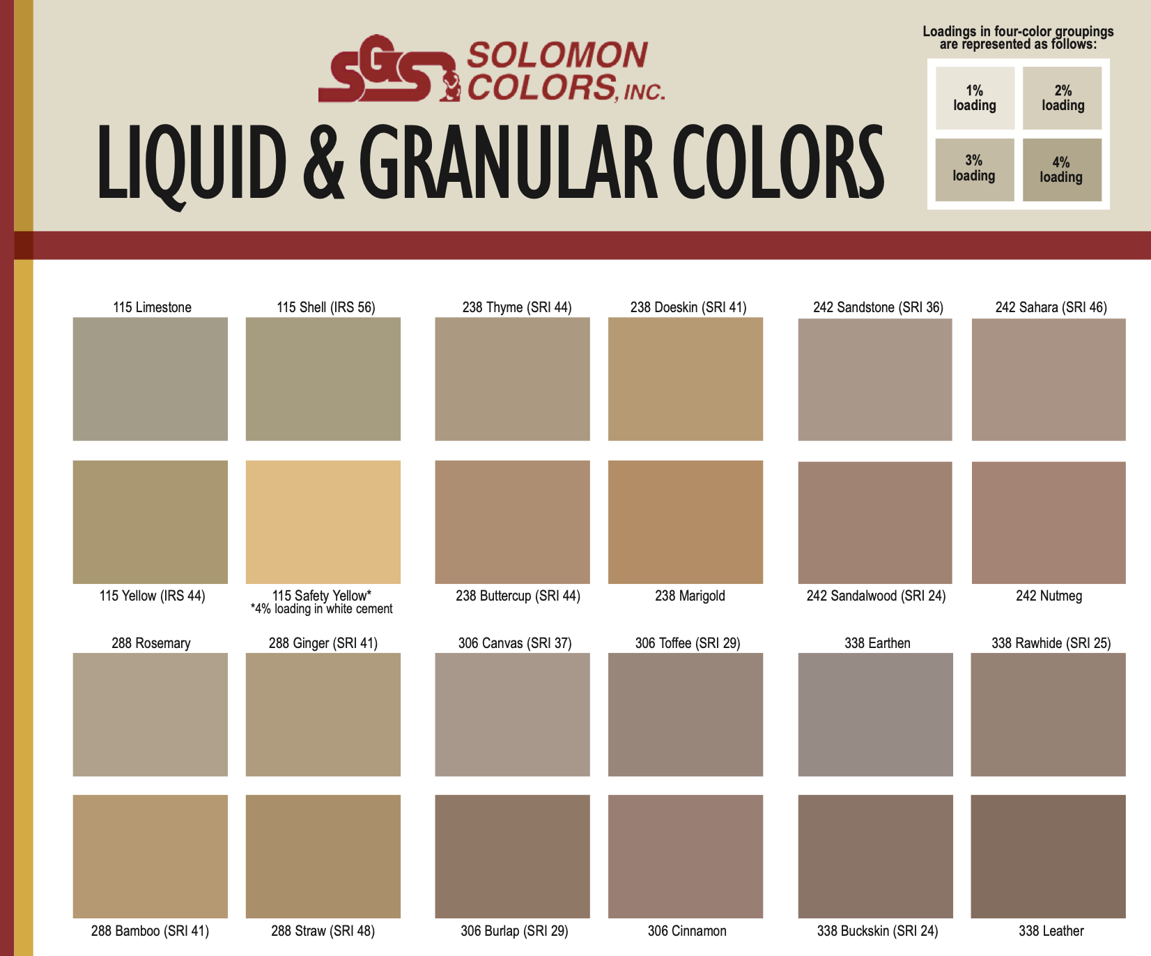 Web solomon integral colors for ready mix (colorflo, dry pigment, granular pigment) color cards most of these colors are available in dry, colorflo. Web solomon colors systems quickly and efficiently batch thousands of colors from 4 primary sg granular pigments, eliminating the need to maintain large inventories of dry pigment. Web create consistently and uniformly colored concrete using solomon colors dry integral color. Color hardener is available in 42 standard colors and has. Web find color chips and technical specifications for solomon colors' liquid, granular and dry integral colors for concrete.