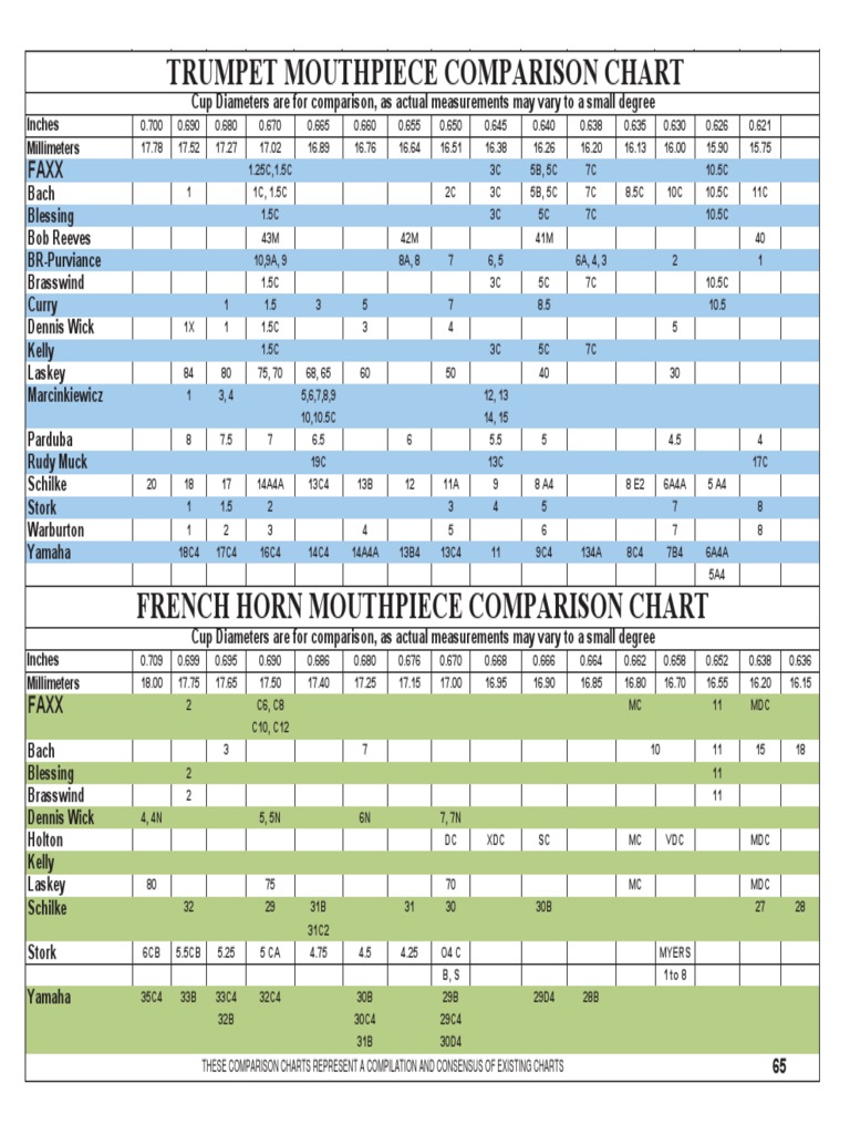 Please do not take diameter measurements too seriously. Attributes such as cup depth, rim shape, bite, and backbore also make a big difference in how a mouthpiece plays and feels. Most of the time the difference in columns can be 0.02 of an inch (0.5 mm). Attributes such as cup depth, rim shape, bite, and backbore also make a big difference in how a mouthpiece plays and feels. Web trumpet mouthpiece comparison chart cup diameters are for comparison purposes only.